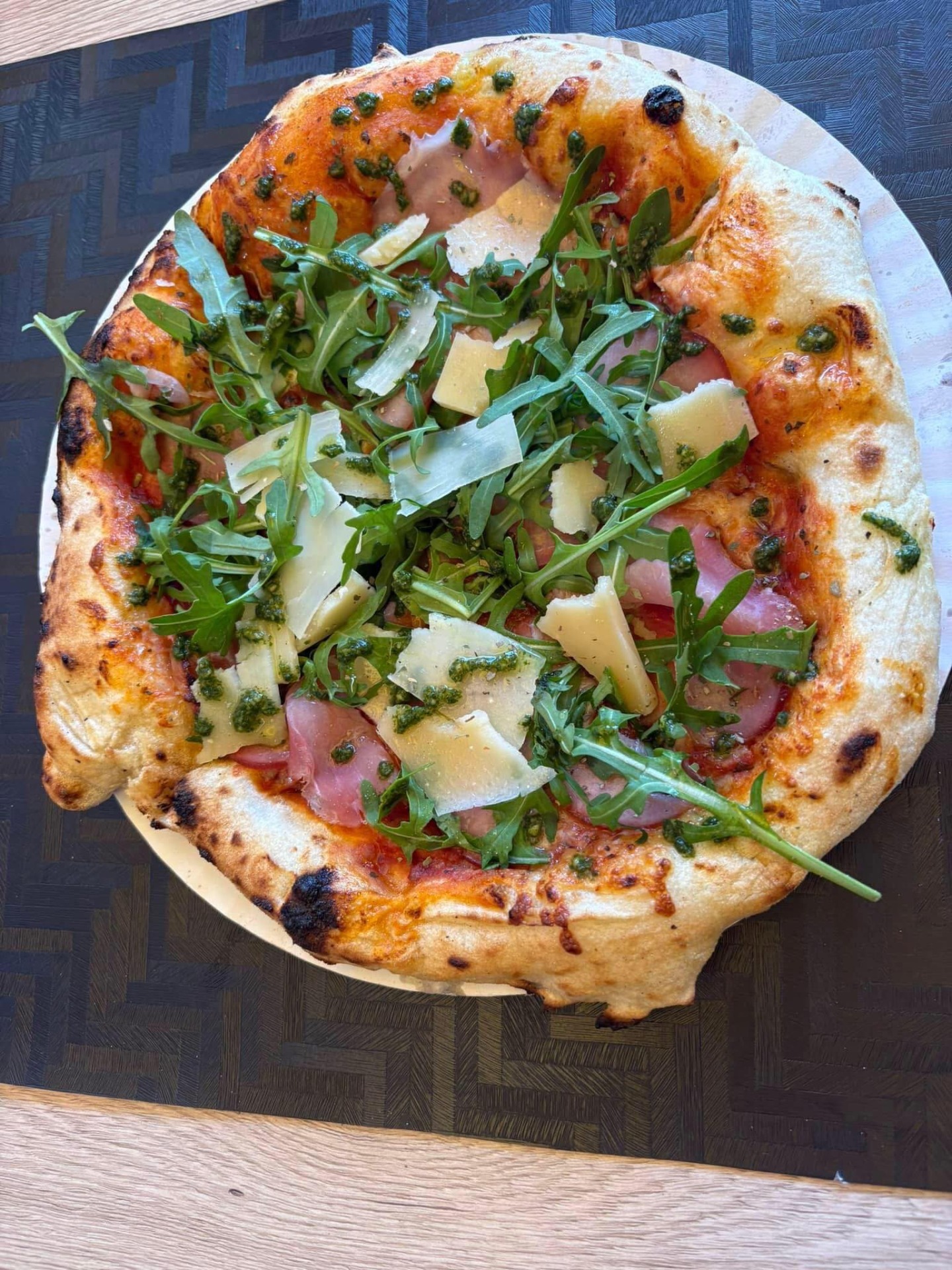Paradicsomos alap, mozarella, Prosciutto cotto sonka, rukkola, pesto, parmezán sajt